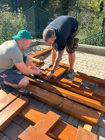 Nachdem alle Holzteile zugesägt, geschliffen und gestrichen waren, trugen wir sie gemeinsam hinauf zu dem Platz, an dem die Radlerrast entstehen soll. Vor Ort sortierten wir die einzelnen Elemente sorgfältig und legten die passenden Teile für den Aufbau bereit. Jetzt kann mit dem Zusammenschrauben begonnen werden – ein weiterer spannender Schritt auf dem Weg zur fertigen Raststation!