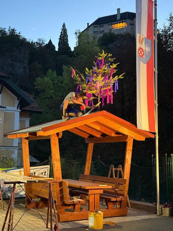 Gemeinsam als Gruppe stellten wir das Dach unserer Radlerrast fertig. Dafür wurden das Traufenband, das Dachauflegeband und schließlich die Dacheindeckung sorgfältig angebracht. Als krönenden Abschluss montierten wir den Gleichenbaum – und ließen es uns nicht nehmen, diesen Meilenstein mit einem kleinen Gleichenfest gebührend zu feiern.
