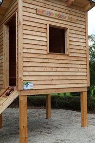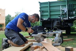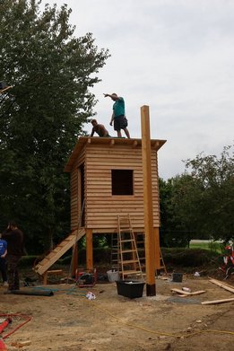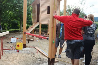 Team Baumhaus: begann sofort mit dem Zuschneiden des Holzes und startete den Bau des Baumhauses.