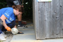 Team Spielplatz „Überblick“: schloss die Pflasterarbeiten ab, zog den Sandkasten glatt und reinigte die Holzränder.