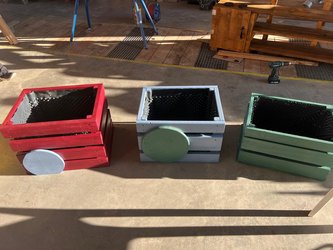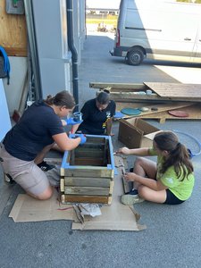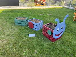 - Hochbeete in Raupenform: Kisten angefertigt, werden aktuell bemalt, Kopf ist ausgeschnitten und ebenfalls bemalt