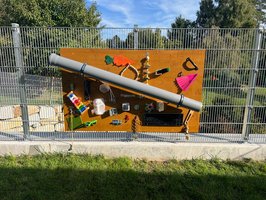 Kaum angekommen, greifen wir wieder zu Akkuschrauber & Pinsel. herumliegende Einzelteile werden verschraubt, die Matschküche erhält farbige Details, die Sensorikwand nimmt Gestalt an.