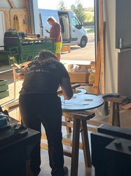 Ein Teil des Teams macht sich gleich auf die Suche nach brauchbarem Holz für die geplanten Spielgeräte. Währenddessen suche ich mir einen Sitzplatz in der Werkstatt – Blog schreiben, Fotos sortieren, Social Media vorbereiten… auch das gehört zum Projekt!