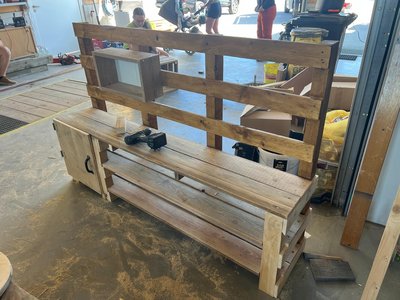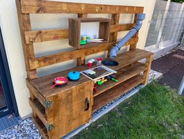- Matschküche: ist zusammengebaut, mit Hängeregal und „Backofen“ ausgestattet, abgeschliffen