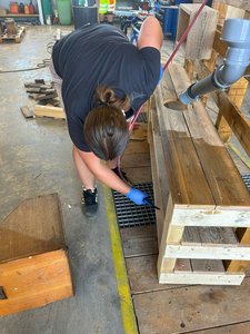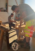Anschließend geht es für uns alle wieder zurück an die Arbeit. Das Vogelhaus bekommt seinen schützenden Lasuranstrich, damit die Kinder die Vögel auch möglichst lange Zeit beim Futter picken beobachten können. Die Teile des Raupenhochbeetes sowie die Matschküche sind nun fast alle ausgeschnitten und zusammengebaut. Diese werden nun in den nächsten Stunden sorgfältig geschliffen.