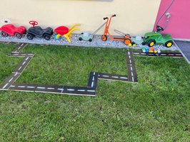 Danach ziehen wir mit den ersten fertigen Objekten Richtung Tagesbetreuungseinrichtung. Die Matschküche bekommt ihren Platz, die Spielstraße wird verlegt und noch vieles mehr vorbereitet.