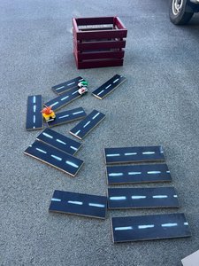 - Spielstraße aus Holzbrettern: alle Bretter zu Straßenteilen transformiert, Autos stehen in den Startlöchern