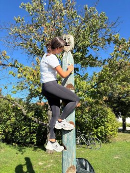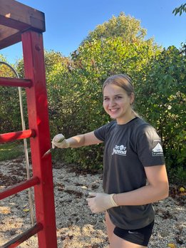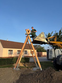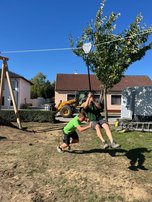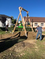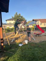 Nach einer Frühstückspause ging es gestärkt weiter mit der Nestschaukel. Diese wurde montiert und mit etwas mehr Kies versehen. Auch die Seilbahn wurde fertig aufgehangen. Um die Sicherheit der Geräte zu gewährleisten, entpuppte sich unser LJ-Leiter als Gerätetester.