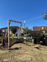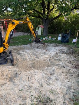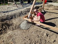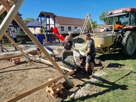 Tag 2 startete um 7 Uhr mit der Sandkiste. Es wird teilweise mit Hilfe eines Mini-Baggers, teilweise mit Hand der Sand aufgelockert um den Kindern das Spielen zu erleichtern. Außerdem wurde für die neue Seilbahn die Halterung der Reifen moniert, sowie der Erdhügel hergerichtet.