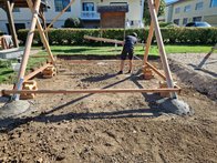 Angefangen mit dem Abbau der alten Geräte bzw. danach das Aufstellen der neuen (Gerüst der Nestschaukel, Seilbahn oder der Balancierbrücke) haben wir nach dem Startpfiff viel erledigt. Zum Beispiel Schleifen, Betonieren, Unkraut zupfen, verteilen des Kies und der Erde, etc.