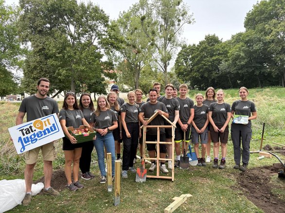 Während der eine Teil fleißig am Graben und Schaufeln war, begann der andere Teil mit der Planung des Insektenhotels. Auch hierfür wurde uns ein Plan sowie das Material bereitgestellt. Nach kurzer Besprechung wurde dann auch die Säge gestartet und die ersten Bretter zugeschnitten und im Anschluss miteinander verschraubt.