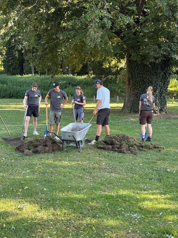 Nachdem alle Holzbalken verschraubt waren, ging es mit dem Befüllen los. Doch auch hier lief nicht alles ganz nach Plan, denn uns gingen Materialien wie Äste, Moos, Steine und Sand aus, um den Weg zu befüllen. Also schwärmten wir aus und besorgten heruntergefallene Äste und Moos aus dem Schlossgarten und durften sich auf naheliegenden Äckern unserer Mitglieder an Steinen und Sand bedienen.