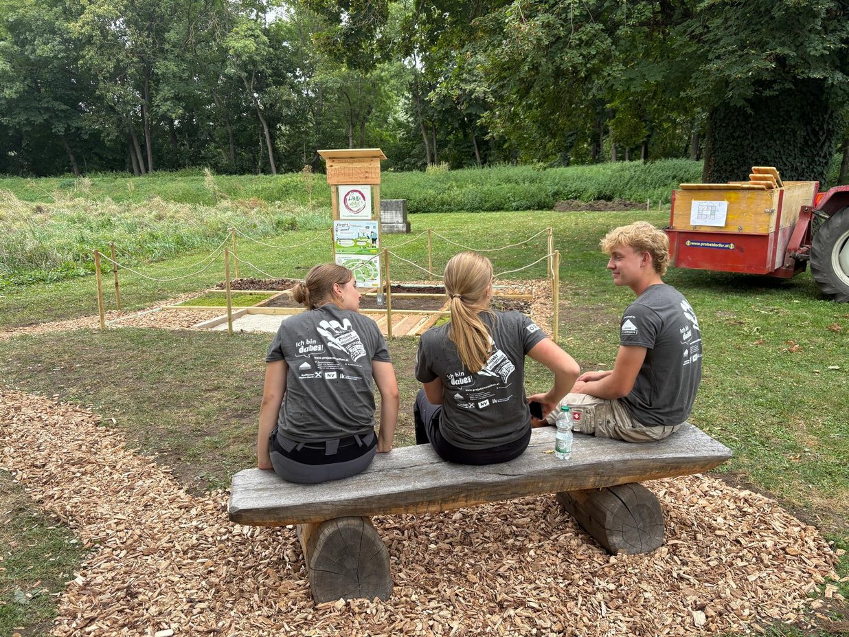 Da der Ausflug zum Baumarkt länger dauerte als erwartet, wurde unser Fortschritt bei dem Barfußweg etwas verzögert, da wir ohne den Holzbegrenzungen den Weg noch nicht befüllen konnten. In unserer Wartezeit wurde jedoch die Idee mit dem Hackschnitzelweg von der Bank zum Schuhe An- und Ausziehen geboren und so schnappten sich unsere fleißigen Mitglieder wieder Schaufel und Spaten und der Weg wurde ausgehoben, mit Fließ verlegt und mit Hackschnitzel befüllt. Aber auch dies dauerte bei unseren fleißigen Helfern nicht lang und wir waren wieder fertig. Doch dann sahen wir unsere Rettung, die Burschen waren wieder mit genügend Holz zurück.