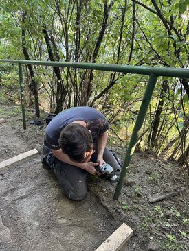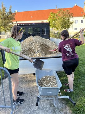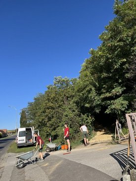 Frisch gestärkt geht es weiter mit den Arbeiten. Aufgabe zwei haben wir bereits am frühen Morgen begonnen und setzen sie nun fort. Nach und nach trudeln immer mehr Vereinskolleg:innen ein. Die Stiegen nehmen langsam Form an, und die ersten werden bereits mit Schotter verfeinert.