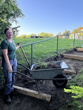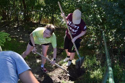 Die Vorbereitungen für die Projektpräsentation laufen auf Hochtouren: Unkraut wird gezupft und die Terrasse gründlich gekehrt.