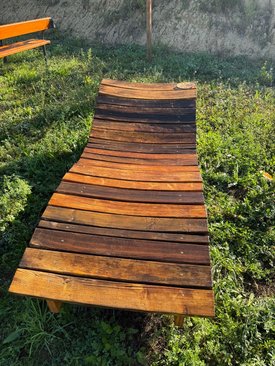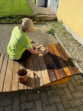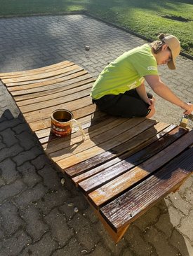 Eine unserer Zusatzaufgaben lautete: Verleiht euren alten Projekten einen neuen Touch und frischt diese auf. Das ließen wir uns nicht zweimal sagen! Im vergangenen Jahr haben wir aus einem alten Weinfass Liegen gebaut. Ein kleines Team machte sich auf den Weg nach Loidesthal und gab den Liegen einen neuen frischen Look. Mit Pinsel und Lack ging es gleich voller Elan ans Werk.