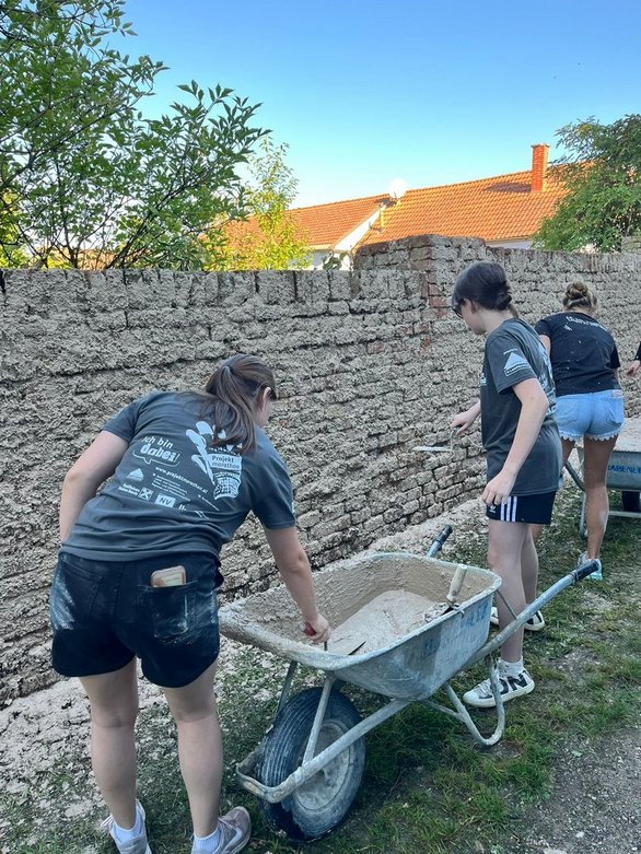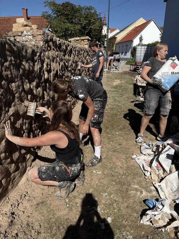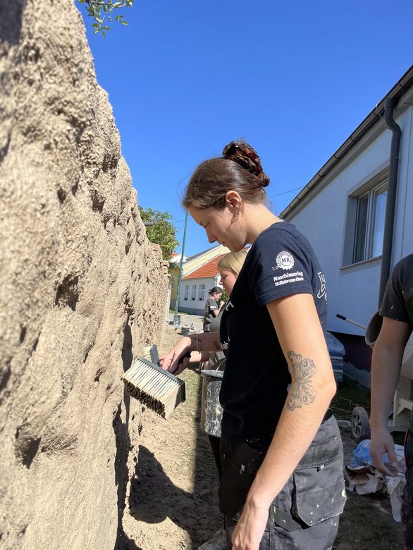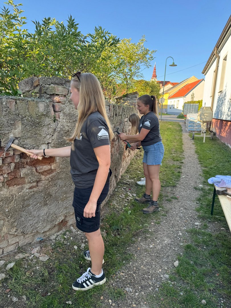 Nach einer kurzen Einführung machten wir uns gleich voller Motivation an die Arbeit. Unsere erste Aufgabe war es, den alten Putz von der Mauer abzuschlagen – und das ging dank Teamwork richtig flott. Schon jetzt können wir uns vorstellen, wie schön die restaurierte Mauer am Ende aussehen wird.