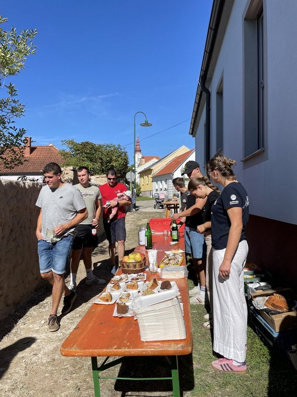 Am letzten Projektnachmittag stand der feierliche Höhepunkt auf dem Programm: die Übergabe an die Wullersdorfer Bevölkerung um 14:00 Uhr. Schon davor waren wir fleißig und bereiteten Getränke vor sowie die köstlichen Kuchenspenden der Bäuerinnen, damit für die Bewirtung alles bereitstand.🍰