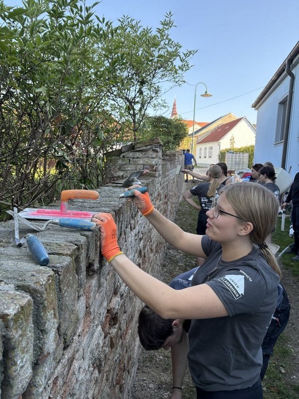 Früh am Morgen, um 7:00 Uhr,  ging’s für uns wieder los – die Mauer ruft! Mit tatkräftiger Unterstützung eines Brabenetz-Mitarbeiters, der uns Arbeitsmaterial mitgebracht und den ganzen Tag über mit Tipps und Tricks versorgt hat, konnten wir gleich ordentlich durchstarten. Den Vormittag verbrachten wir mit abkehren, Rillen verfugen und verputzen der ersten, teilweise auch schon zweiten, Schicht! Auch wurden beschädigte und fehlende Ziegel von unserem Brabenetz Maurer ausgebessert. Besonders gefreut haben wir uns über den Besuch des Landesbeirates und unserer Viertelsreferentin, die uns nicht nur angefeuert haben, sondern auch mit Äpfeln, Traubenzucker und Gummibärchen stärkten.🍏