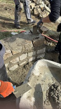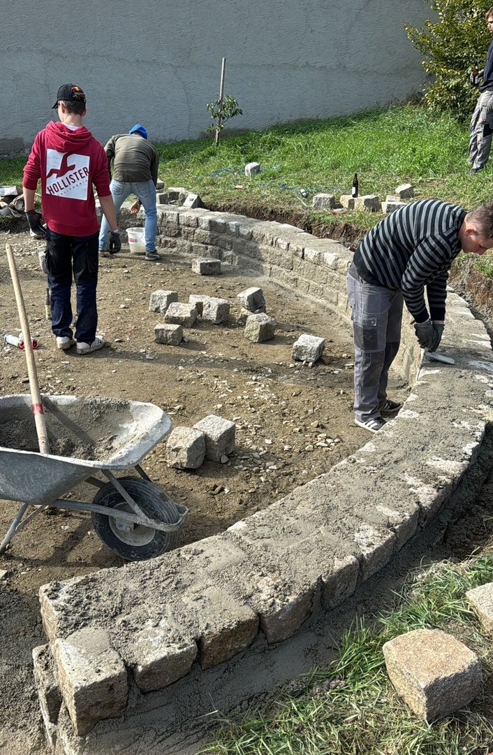 Heute geht es bei unserer Feuerstelle richtig voran! Wir mauern die Wand beim Halbkreis der Feuerstelle und sehen schon, wie sich Stück für Stück alles zusammenfügt. Stein für Stein entsteht das Herzstück unseres Projekts – und die Feuerstelle nimmt immer mehr Gestalt an.
