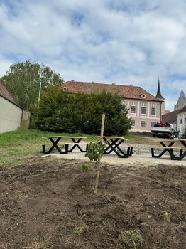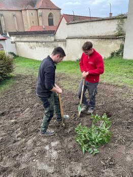 Der dritte und letzte Tag unseres Projektmarathons ist angebrochen! Gleich in der Früh geht es noch einmal in den Bauhof, um die letzten Materialien für den Feinschliff zu holen. Danach heißt es: Endspurt an unserer Feuerstelle. Wir haben einen Metalldeckel zugeschnitten, der später als Absperrung dient. Jetzt fixieren ihn nur noch sorgfältig und setzen unserer Feuerstelle damit das sprichwörtliche i-Tüpfelchen auf. Als besonderes Highlight haben wir auch noch einen Baum, der in Zukunft für angenehmen Schatten sorgen wird hinter die Bänke gepflanzt – ein Stück Nachhaltigkeit, das den Platz noch gemütlicher macht.