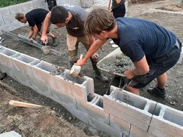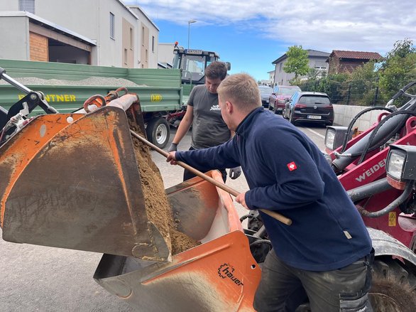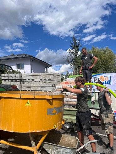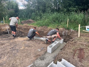 Nach einer kurzen Unterbrechung durch Regen und einem Unterschlupf in der Gemeindehalle, legte wir wieder los. Es wurden die Schallsteine gesetzt und somit die Mauer aufgebaut und weiters mit Beton ausgefüllt.