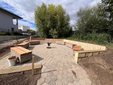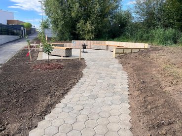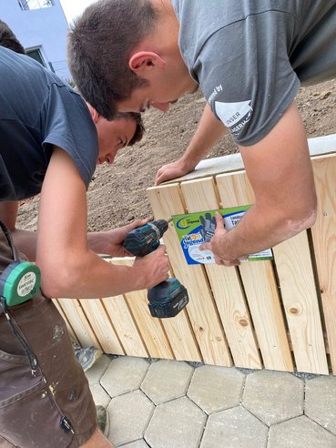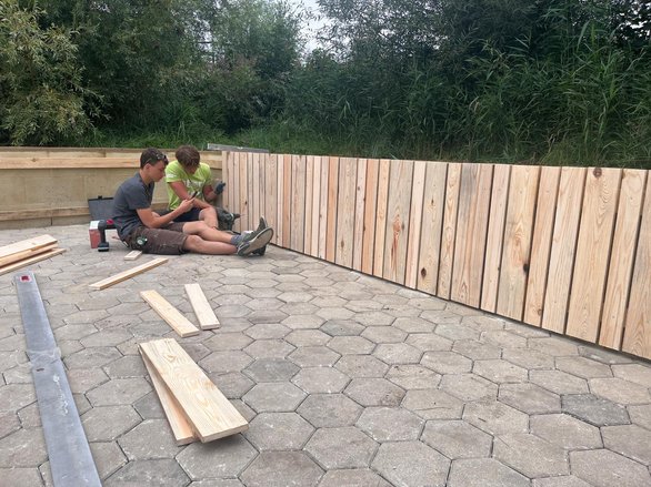 Es wurden die restlichen Pflastersteine verlegt, die wir noch holen mussten, da wir in der Nacht zu wenige davon hatten. Ebenso wurde die Mauer noch einmal überarbeitet und die Holzverkleidung angebracht. Dafür musste das Holz noch in die richtige Länge zugeschnitten werden und anschließen angeschraubt werden.