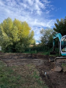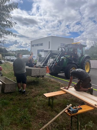 Nach kurzer Zeit kam der Bagger und hub die vorgezeichnete Fläche aus.Währendddessen machte sich ein Teil unserer Mitglieder auf den Weg zu den Blumentrögen und bereiteten diese für den morgigen Tag vor.