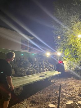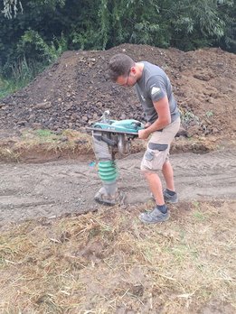Da die Zeit läuft und wir mit dem Ausfüllen der Mauer mit Beton erst um 20:00 Uhr starten konnten, haben wir beschlossen, eine Nachtschicht einzulegen. Um ca. 22:00 Uhr holten wir den Kiesel, welcher dann abgezogen und gerade gemacht wurde. Die Pflastersteine wurden zum Platz gebracht und die Mädls begannen, diese zu verlegen. Die Arbeiten gingen bis um 2:15 Uhr, da dann alle Steine verarbeitet waren.